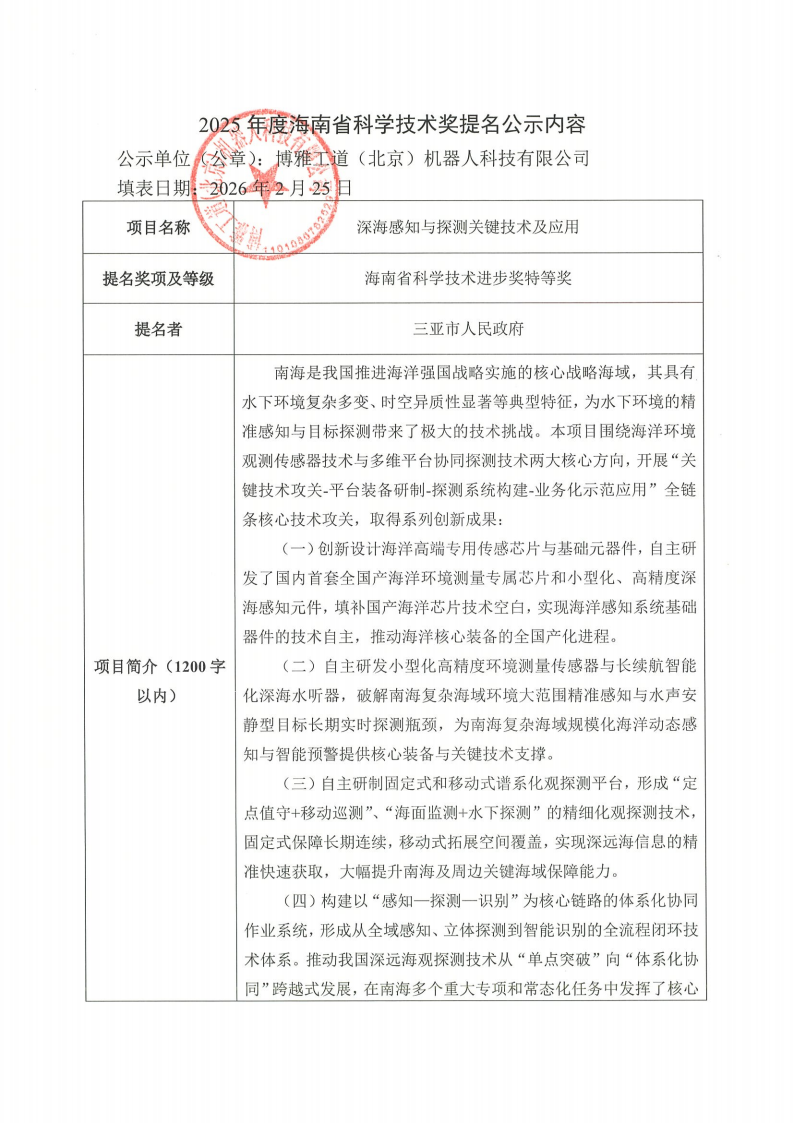 根据海南省科学技术厅发布的《海南省科学技术厅关于2025年度海南省科学技术奖提名工作的通知》要求,我司参与完成的“深海感知与探测关键技术及应用”成果拟通过海南省三亚市人民政府推荐申报2025年度海南省科学技术奖,现予公示。